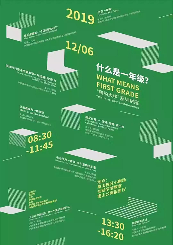 积霜渐重,舞叶不飞,正是2019级一年级新生在中国美术学院面临的第一个冬天。在他们面临诸多学业、艺术乃至人生问题的重要时刻,学校为他们组织了一场《我的大学之什么是一年级?》主题讲座。八位一线教师,八堂人生大课,为处于人生蜕变期的他们诠释了什么是迷茫却有着无限可能的一年级,什么是成熟理性又充满理想的人生规划,什么是终生不变且无怨无悔的艺术追求,什么是身为国美学子必将肩负的传承重担。薪火相传,历久弥新,在传递思想之火的此刻,名为“国美精神”的燧石,必然爆发出精神之火,照亮他们艺术人生的未来与前程。
