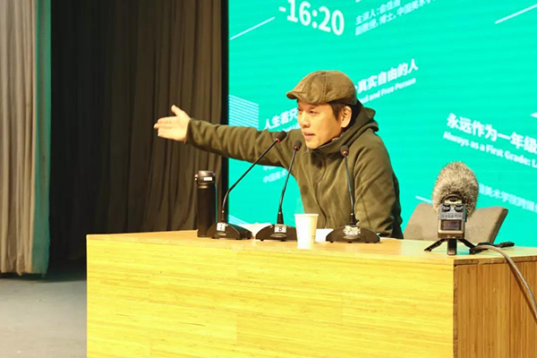孙景刚老师讲述了自己从国美任教到法国学习,最后回到基础部教书的经历,表达了对于国美一年级学生朝气蓬勃的欣赏。他提到学生应该不忘初心,从自己的经历出发去构建起终身追求的主题。要培养起高度的自律和韧性,树立良好的习惯和工作方法,然后要持之以恒。他以许江院长、弗洛伊德等人举例,用生动诙谐的语言道出了艺术的真谛。