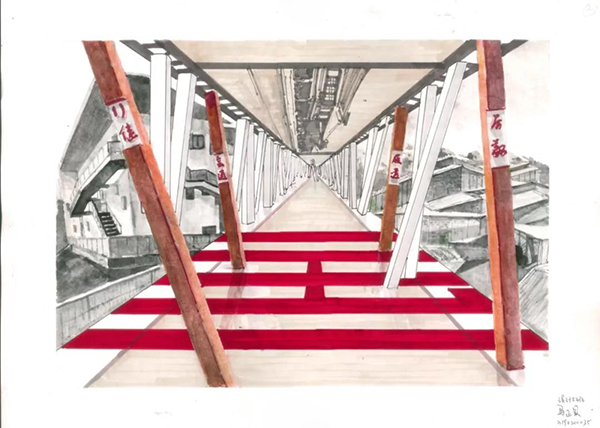 第二幅小卷作品:以鸟和屋檐,天空,树为视角以凸显中国美院的艺术思想,充满生机与活力。