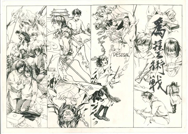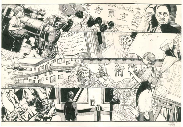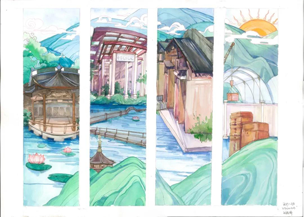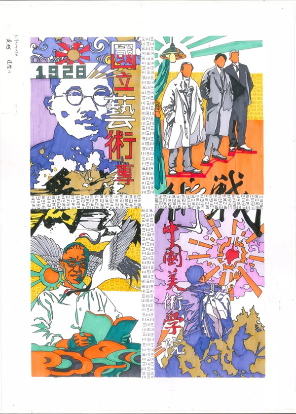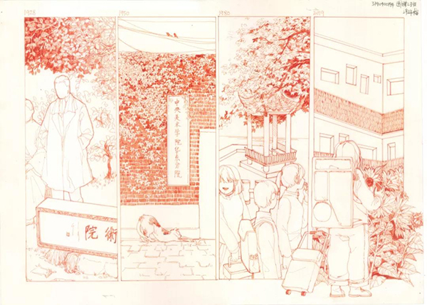 以四幅长卷国画小稿记录中国美院同时也体现着“校”史中的学校文艺书画气息的画面氛围,以淡黄色水色为低画纸的底色以体校“史”中的历史复古韵味。