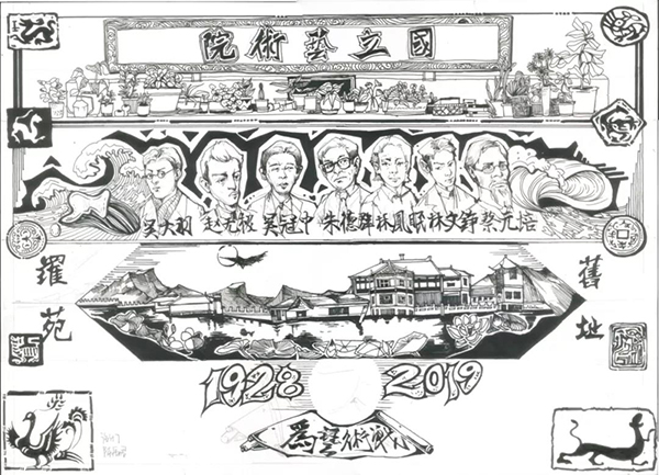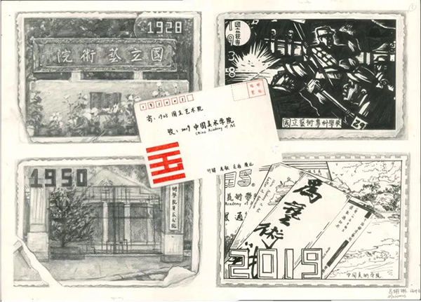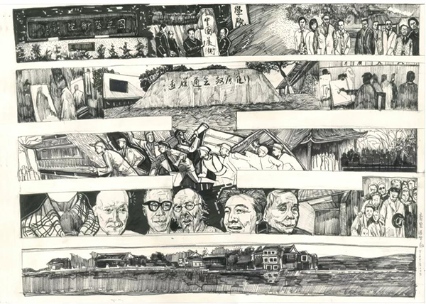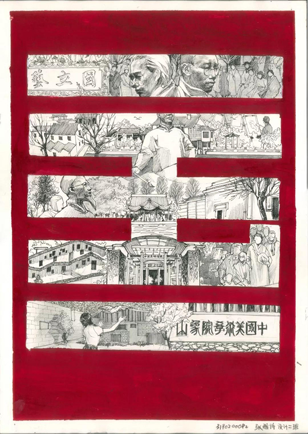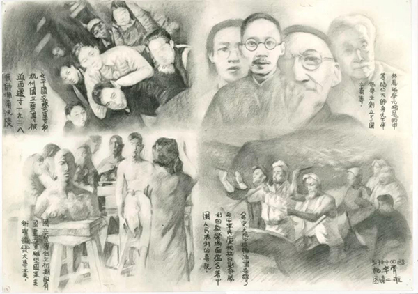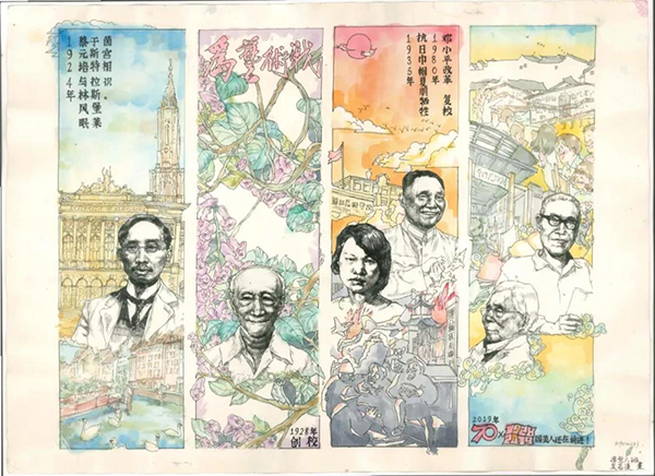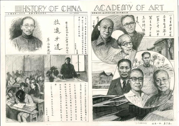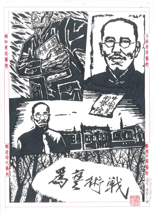 以校史育人的传统在专业基础教学部由来已久,从2016年起,专业基础教学部在推进全过程育人、全方位育人过程中,将学校历史与艺术专业相结合,着力开辟校史育人的新方法,通过挖掘校史中的文脉传承和人文积淀,将静态的档案史料转化为动态的育人资源,让思政工作活起来。今年主题教育过程中,专业基础教学部再次开启“手绘校史”活动,旨在不忘初心,以史励志,将个人投射到校史中,与学校血脉相连。开学初,学部要求每位新生搜集素材,挖掘校史,针对学校诸多艺术大家或历史长河中的某一片段进行梳理,凝练精神,体悟担当,手绘校史。通过近一个月的精心创作和全体任课教师的悉心指导,呈现出千余幅精彩多样的手绘校史作品。