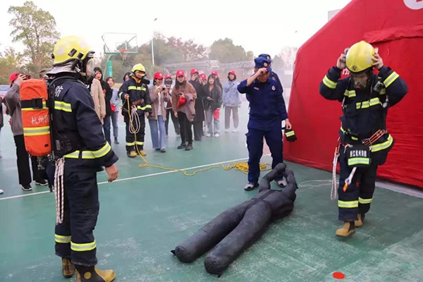 观摩完后,战保大队还精心为师生们安排了体验项目。“来,和美院一对一较高下吧!”人说“人不轻狂枉少年”,设院学子也有股不服输的劲。为了让同学们更近距离接触日常训练项目,由四位男生组成的“美院一队”与四名消防员开展穿戴消防装备速度的大比拼,粉丝们在一旁大声加油鼓气,并纷纷拿出手机记录这精彩的瞬间。此时现场气氛达到最高点。整装完毕,“美院一队”接到任务,冲进模拟火场解救120斤的假人,其余同学也沿着生命绳领略了一番消防战士冲锋火场一线的真实情景。冲出火场的那一刹那,大家纷纷感叹道:“消防员真的是太不容易了!”大家深刻体会到在滚滚浓烟下逃生的难度,也为在场的消防员竖起了大拇指。