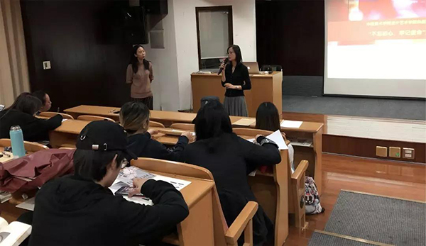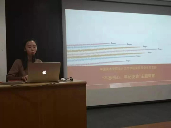 2019年10月16日,染织与服装设计系学生党支部在18号楼313报告厅开展 “不忘初心、牢记使命”主题教育活动。支部书记王书莹给同学们上了一堂“青春心向党、设计新青年”专题党课,设计艺术学院党总支副书记刘超群老师、染服系教师党支部书记郎青老师到堂听课指导。