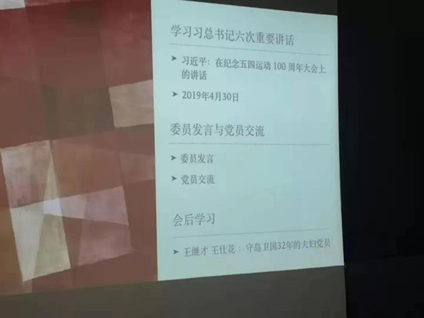 首先,支部书记王书莹老师带领全体学生党员领学了习总书记六次重要讲话内容,要求大家进一步坚定理想信念,增强责任感和使命感,作为新时代的中国青年要树立远大理想,要热爱祖国,要担当时代责任,要勇于砥砺奋斗,要练就过硬本领,要锤炼品德修为。