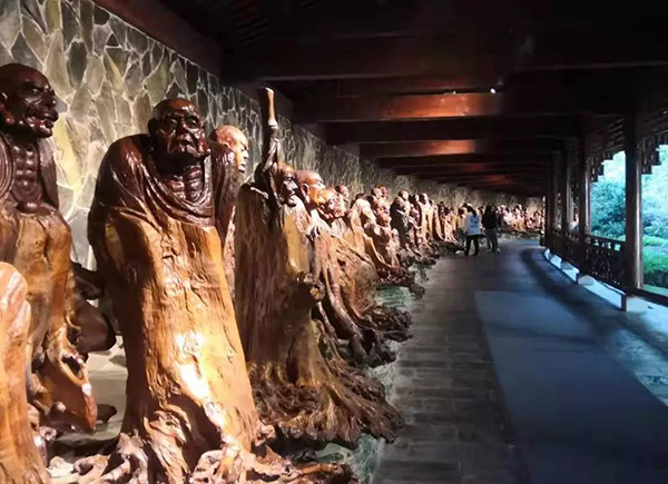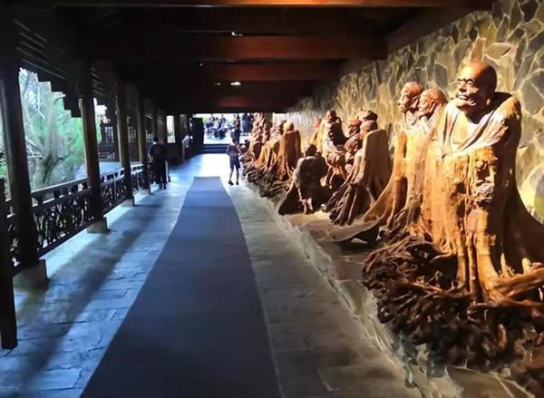 下午,我们参观了根宫佛国文化旅游区“开化县根博园”, 里面陈列着有世界上最大的根艺释迦牟尼佛造像和680米长的巨型根雕五佰罗汉阵,以及根艺文献资料、根艺名家名作,工艺流程和醉根文化展示的作品等。从中我们了解到徐谷青大师在对中国根雕艺术之乡(开化县)的创立和国家文化产业示范基地、国家级景区等的创建中起到核心作用。