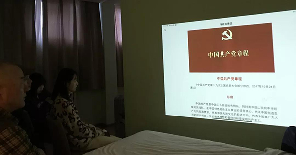 十月二十二日,孟老师、潘老师组织学生党员及入党积极分子在舟车劳顿一天的学习之余,在酒店下榻后,观看红色经典电影《开国大典》、《人民英雄纪念碑》制作纪录片。