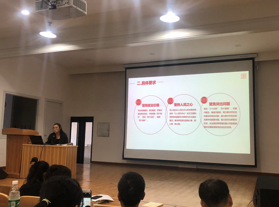 要求全体党员通读《习近平关于“不忘初心、牢记使命”重要论述选编》,《习近平新时代中国特色社会主义思想学习纲要》,学习党章、学习党史、新中国史。同时做到读原著学原文悟原理,开展专题学习研讨,不断丰富学习教育形式。带领全体师生党员深入践行以人民为中心的发展思想,勇担党和国家艺术教育与文化建设重任,促进全体党员充分认识开展主题教育和不断学习的重大意义,致力于把学习教育与研究落实贯通起来,努力取得实实在在成效。