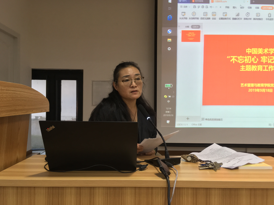 2019年9月18日,中午12点10分,在9号楼学术报告厅,艺术管理与教育学院党总支组织开展了“不忘初心、牢记使命”系列主题教育会议。中国美术学院主题教育工作组:黄学和老师莅临会议,艺术管理与教育学院党总支书记、副院长李梅教授全面主持本次会议,艺术管理与教育学院院长、党总支副书记黄骏教授,学院中层干部及全院师生党员参加了本次会议。